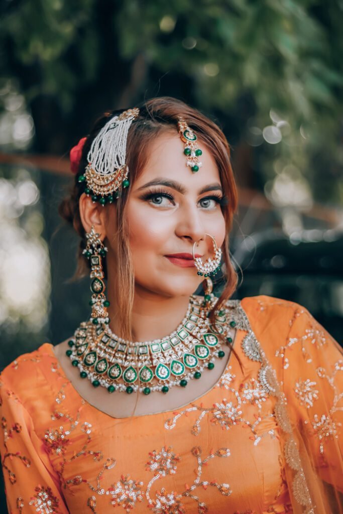 Maang Tikka: Worn on the forehead, this ornament comprises a chain with a central pendant that rests on the bride’s hairline. It’s often adorned with gemstones, pearls, or intricate designs.