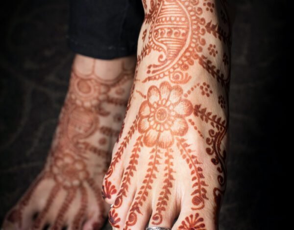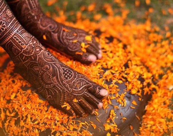 Traditional Indian Designs: These often feature intricate patterns, paisleys, flowers, peacocks, and mandalas. They cover the hands and feet with elaborate designs, symbolizing joy, beauty, and spiritual awakening.